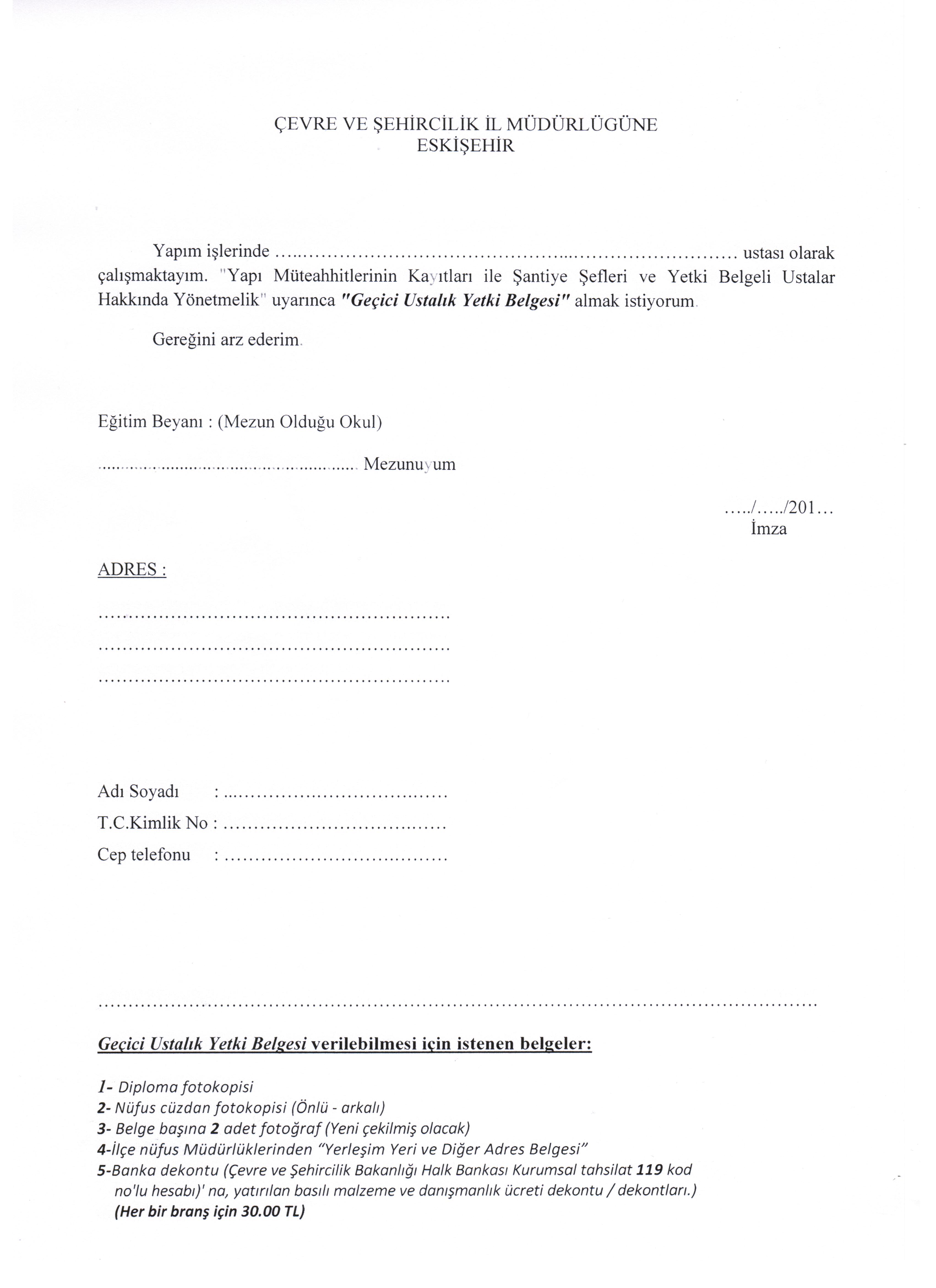 GEÇİCİ USTALIK BELGESİ BAŞVURU DİLEKÇE ÖRNEĞİ