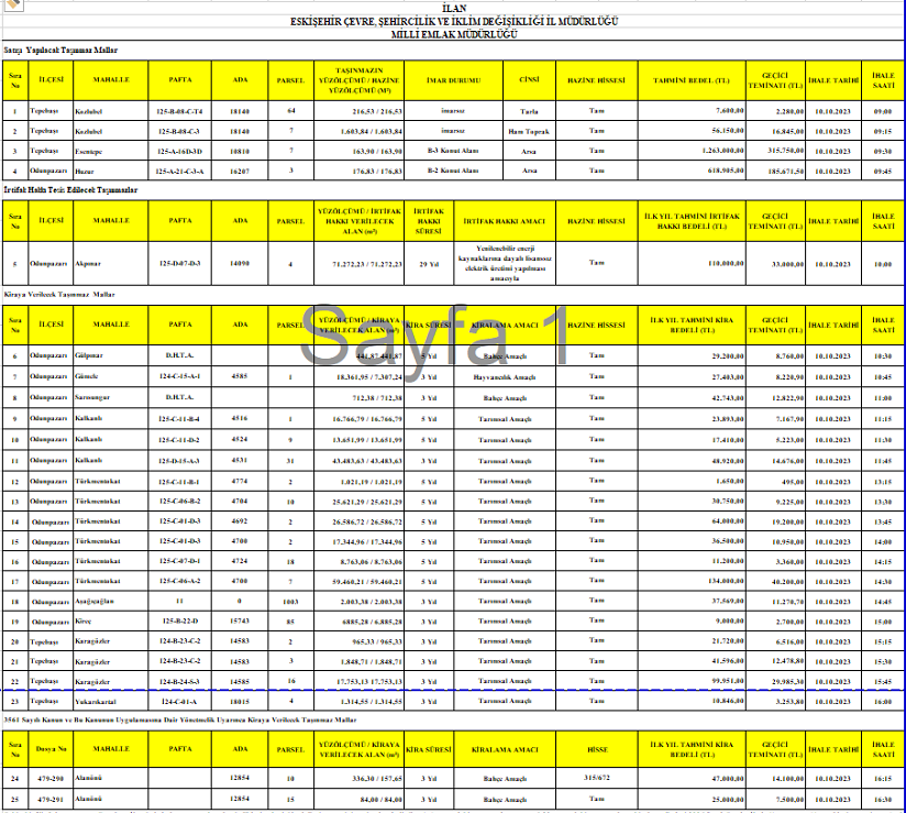 Eskişehir İli, Odunpazarı ve Tepebaşı İlçesinde bulunan ve yukarıda nitelikleri, tahmini bedelleri ve geçici teminatları belirtilen 1-4 arasındaki taşınmazların satış, 6-23 arasındaki taşınmazların kiralama ihalesi 2886 Sayılı Devlet İhale Kanununun 45. maddesi gereğince Açık Teklif Usulü ile, 5. sıradaki taşınmazın irtifak hakkı tesisi ihalesi ise aynı kanunun 51/g maddesi uyarınca pazarlık usulü ile, karşılarında belirtilen tarih ve saatte Arifiye Mah.Kıbrıs Şehitleri Cad.No:29 Odunpazarı/ESKİŞEHİR (Ayrıntılı irtibat telefonu: 0 222 230 39 54) adresindeki Çevre, Şehircilik ve İklim Değişikliği İl Müdürlüğünde (Milli Emlak Müdürlüğü) teşekkül edecek komisyon huzurunda yapılacaktır.